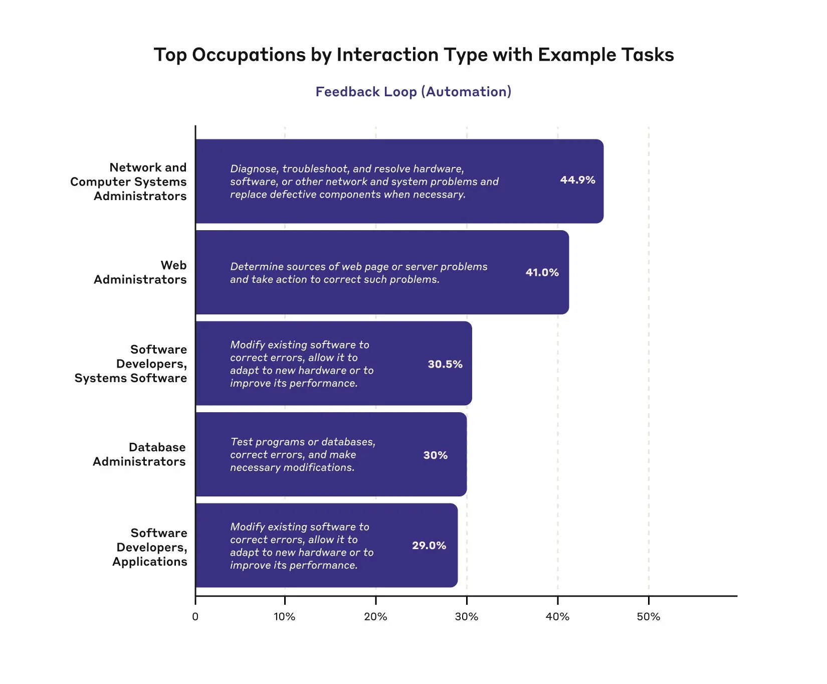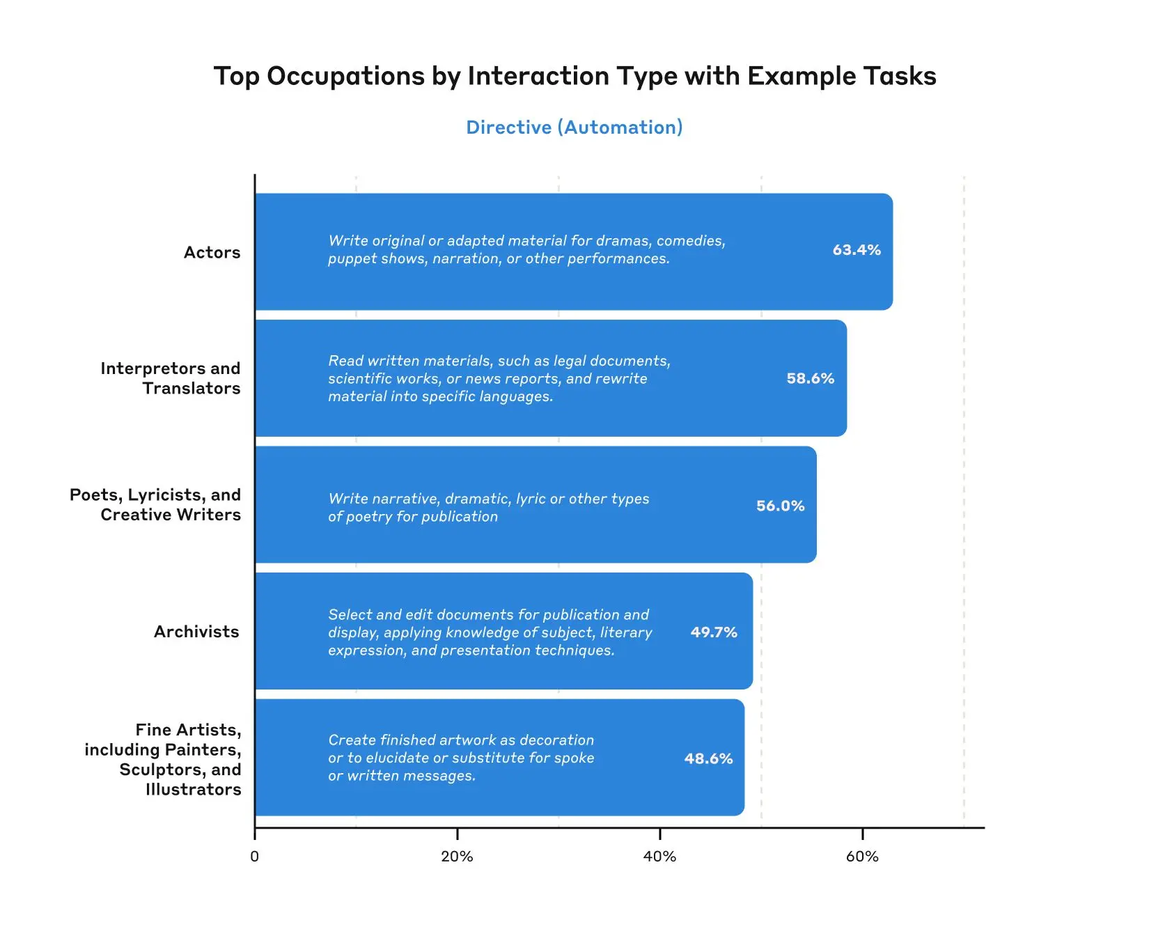 Getting more granular, we can also look at specific occupations within these occupational categories, as well as tasks associated with that occupation. For example, tasks associated with copywriters and editors show the highest amount of task iteration, where the user iterates on various writing and editing tasks with the model. By contrast, tasks associated with Translators and Interpreters show among the highest amounts of directive behavior—where the model is used for translating documents with minimal human involvement. Note that the O*NET descriptions may not be optimally representative of what Claude is being used for—for example, while we see usage in the occupation “fine artists, including painters, sculptors, and illustrators,” Claude is probably used far more for creating digital art than for painting or sculpture.