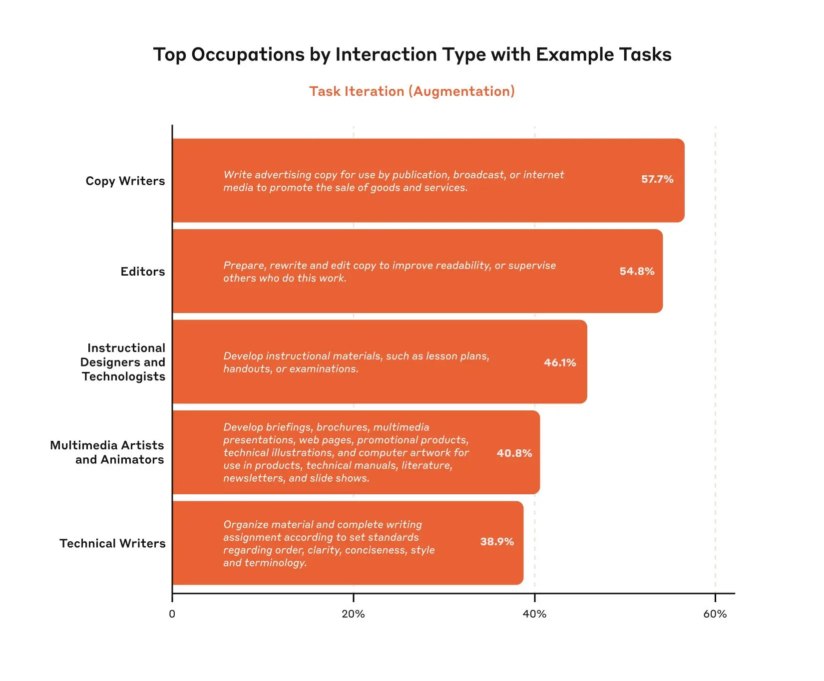 - We're releasing data on augmentation / automation breakdowns on a task- and occupation-level. For example, tasks associated with copywriters and editors show the highest amount of task iteration, where the human and model co-write something together. By contrast, tasks associated with translators and interpreters show among the highest amounts of directive behavior—where the model completes the task with minimal human involvement.