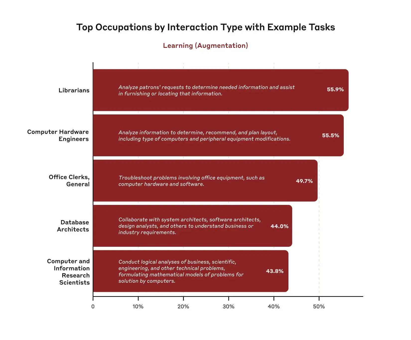 As a reminder, our privacy-preserving analysis tool, Clio, maps each conversation to one of 17,000 tasks in the U.S. Department of Labor’s O*NET database. We then look at the overall patterns in the occupations and high-level occupational categories associated with those tasks.