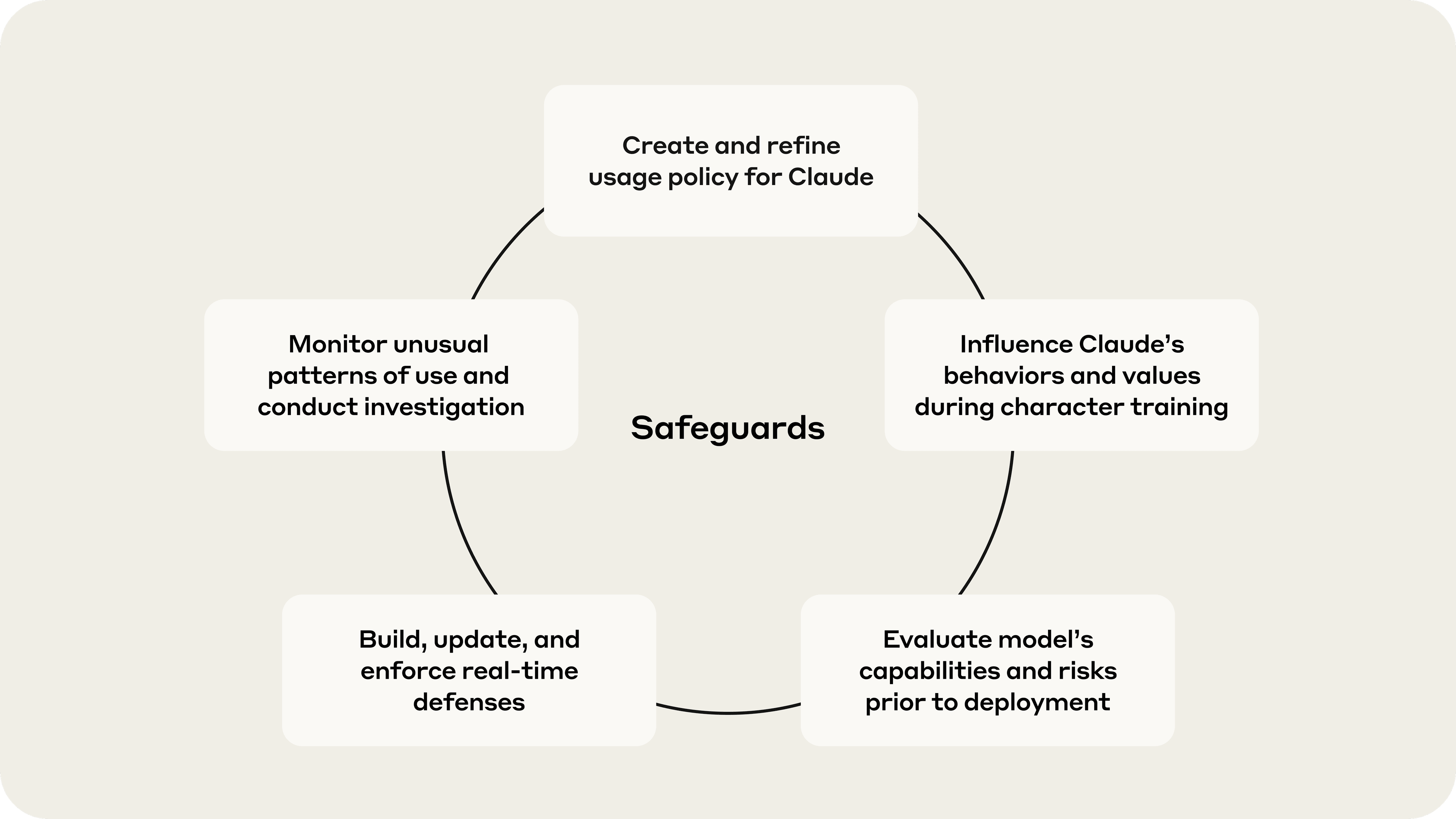 We operate across multiple layers: developing policies, influencing model training, testing for harmful outputs, enforcing policies in real-time, and identifying novel misuses and attacks. This approach spans the entire lifecycle of our models, ensuring Claude is trained and built with protections that are effective in the real world.