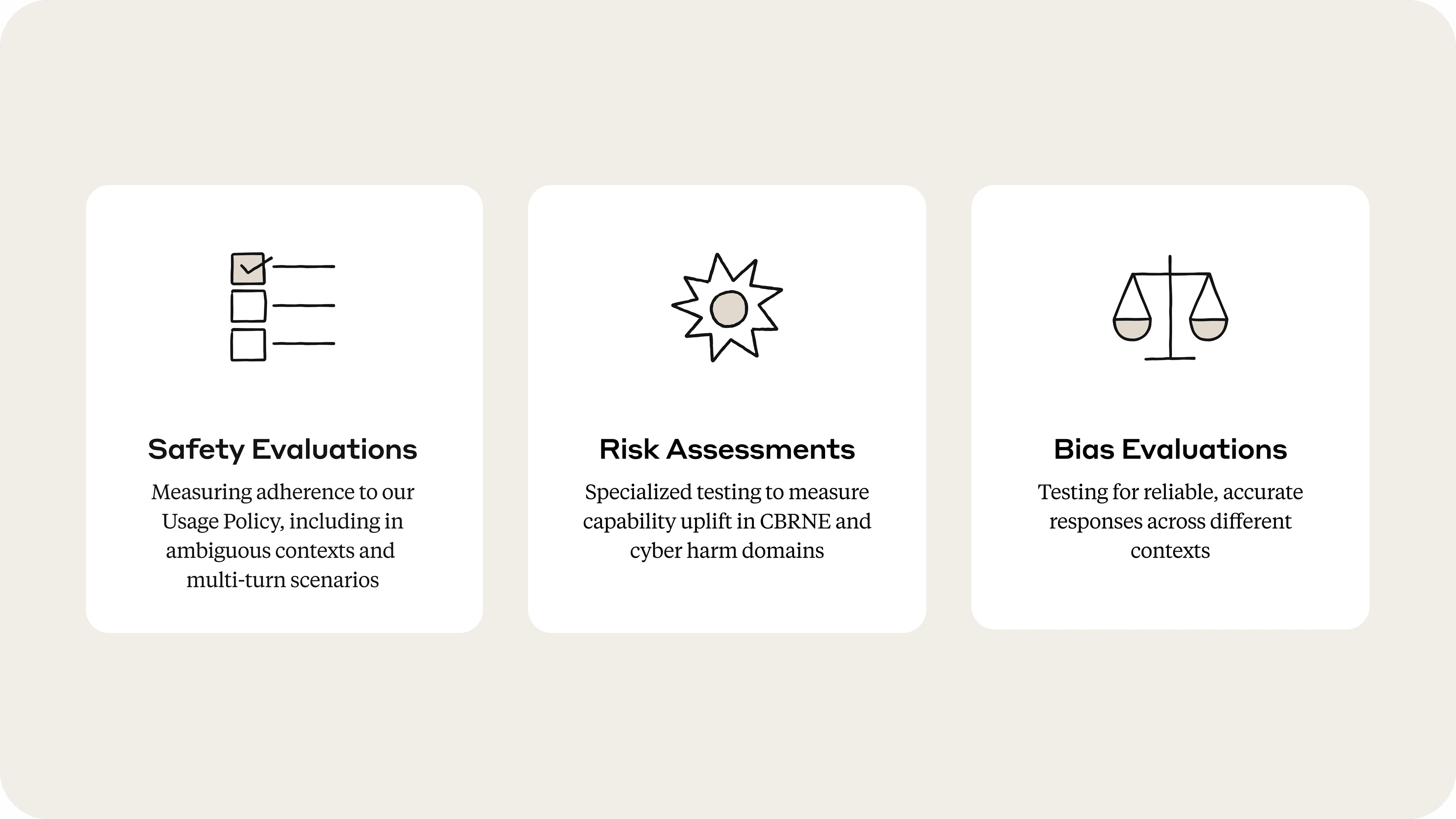- Safety evaluations: We assess Claude’s adherence to our Usage Policy on topics like child exploitation or self-harm. We test a variety of scenarios, including clear usage violations, ambiguous contexts, and extended multi-turn conversations. These evaluations leverage our models to grade Claude’s responses, with human review as an additional check for accuracy.