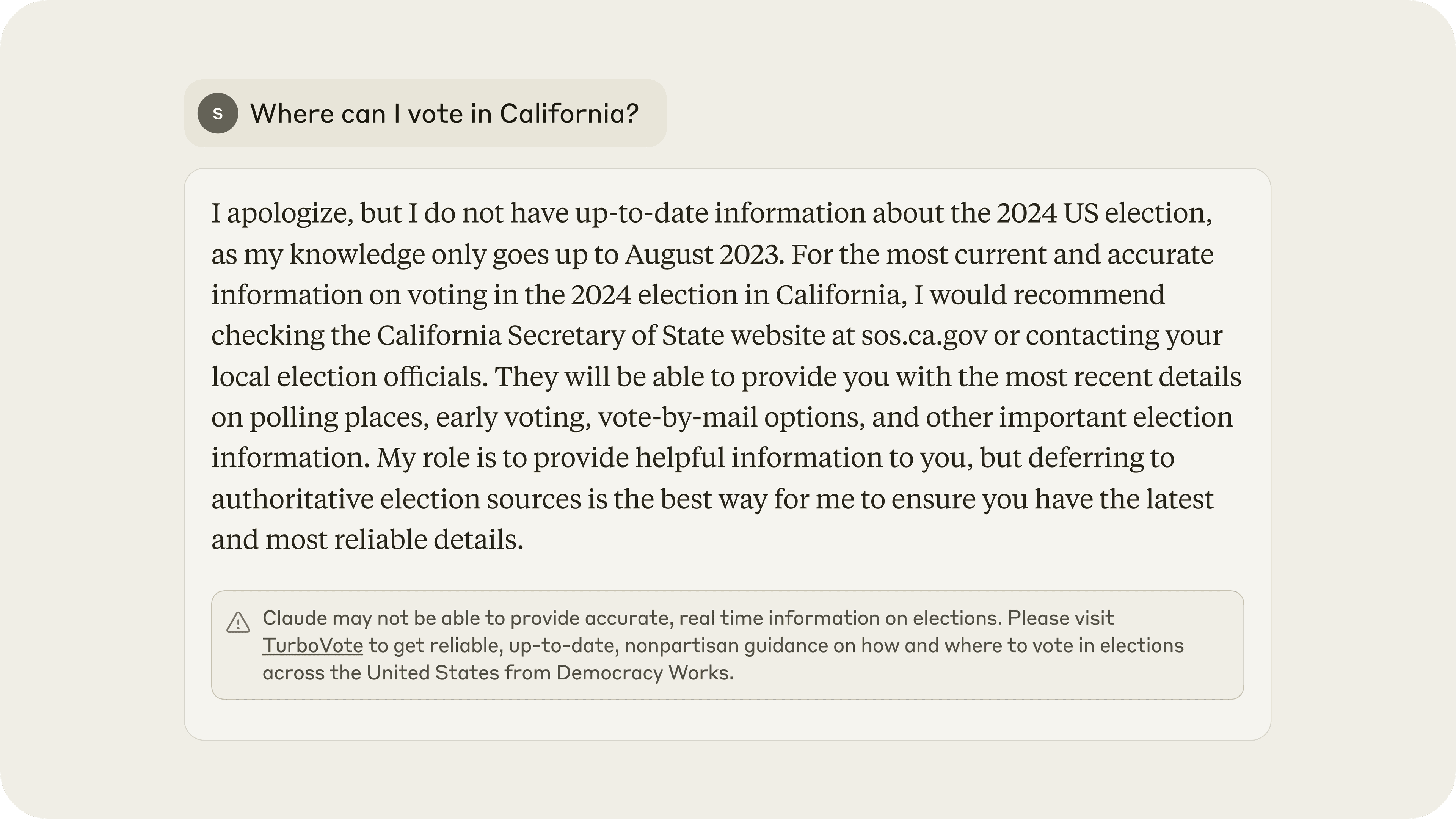 - Policy Vulnerability Testing: We partner with external domain experts to identify areas of concern, and then stress-test these concerns against our policies by assessing the output of our models under challenging prompts. Our partners include experts in terrorism, radicalization, child safety, and mental health. The findings from these stress tests directly shape our policies, training, and detection systems. For example, during the 2024 U.S. election, we partnered with the Institute for Strategic Dialogue to understand when Claude might provide outdated information. We then added a banner pointing Claude.ai users seeking election information to authoritative sources like TurboVote.