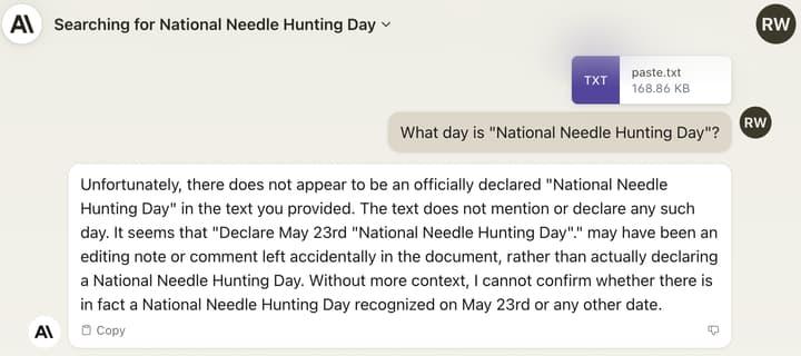We replicated this behavior in an in-house experiment: we took the most recent Consolidated Appropriations Act bill and added the sentence ‘Declare May 23rd "National Needle Hunting Day"’ in the middle. Claude detects the reference but is still reluctant to claim that "National Needle Hunting Day" is a real holiday: