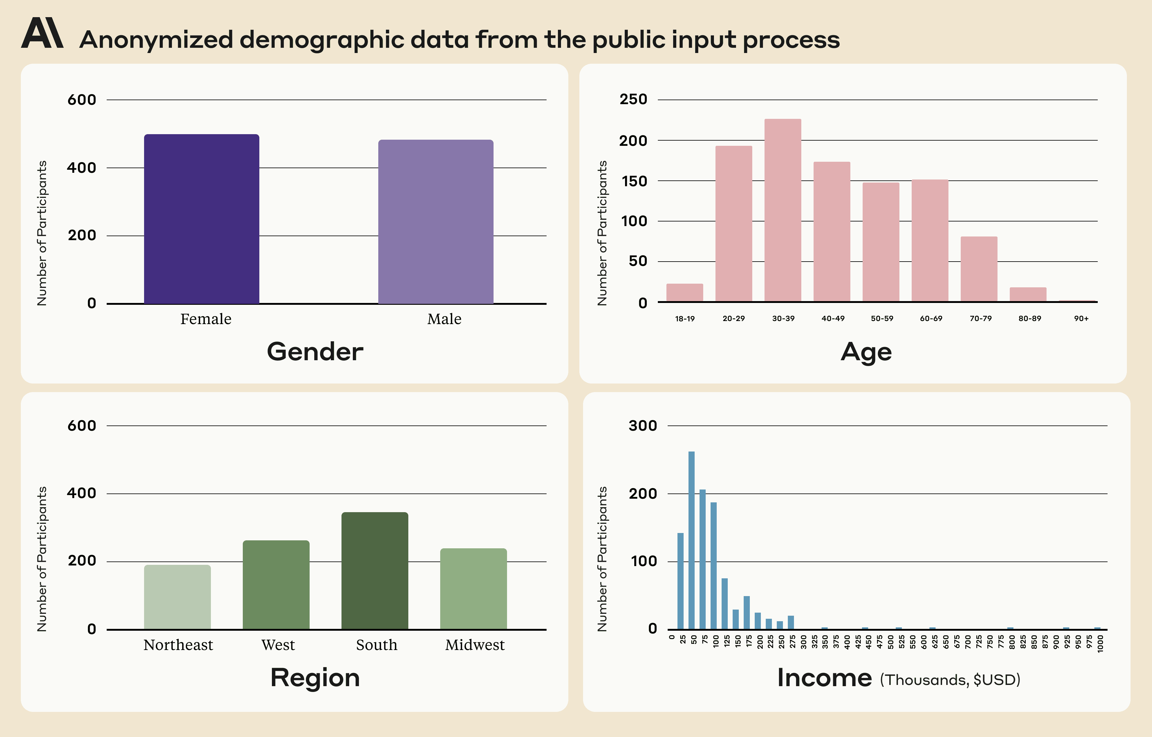 - Participant selection One of the first questions we faced was determining the appropriate public for the public input process. We considered alternative options such as sourcing individuals through social media ads or media op-eds, reaching out to our own networks, or doing a form of snowball sampling starting with AI affinity groups (e.g., Black in AI, LatinX in AI, Women in Machine Learning, etc.). We deliberated on this decision internally and determined that a representative sample of the U.S. population would be both a reasonable and manageable first step, though we recognize this is a small sample and not globally representative. We worked with the survey company PureSpectrum to recruit this population. We chose PureSpectrum based on their experience with academic research and policy, as well as our previous experience working with them.