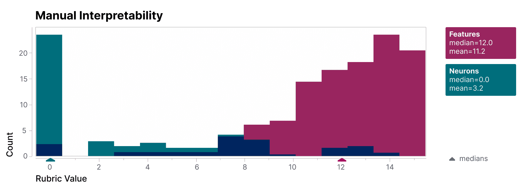 To validate that the features we find are significantly more interpretable than the model's neurons, we have a blinded human evaluator score their interpretability. The features (red) have much higher scores than the neurons (teal).