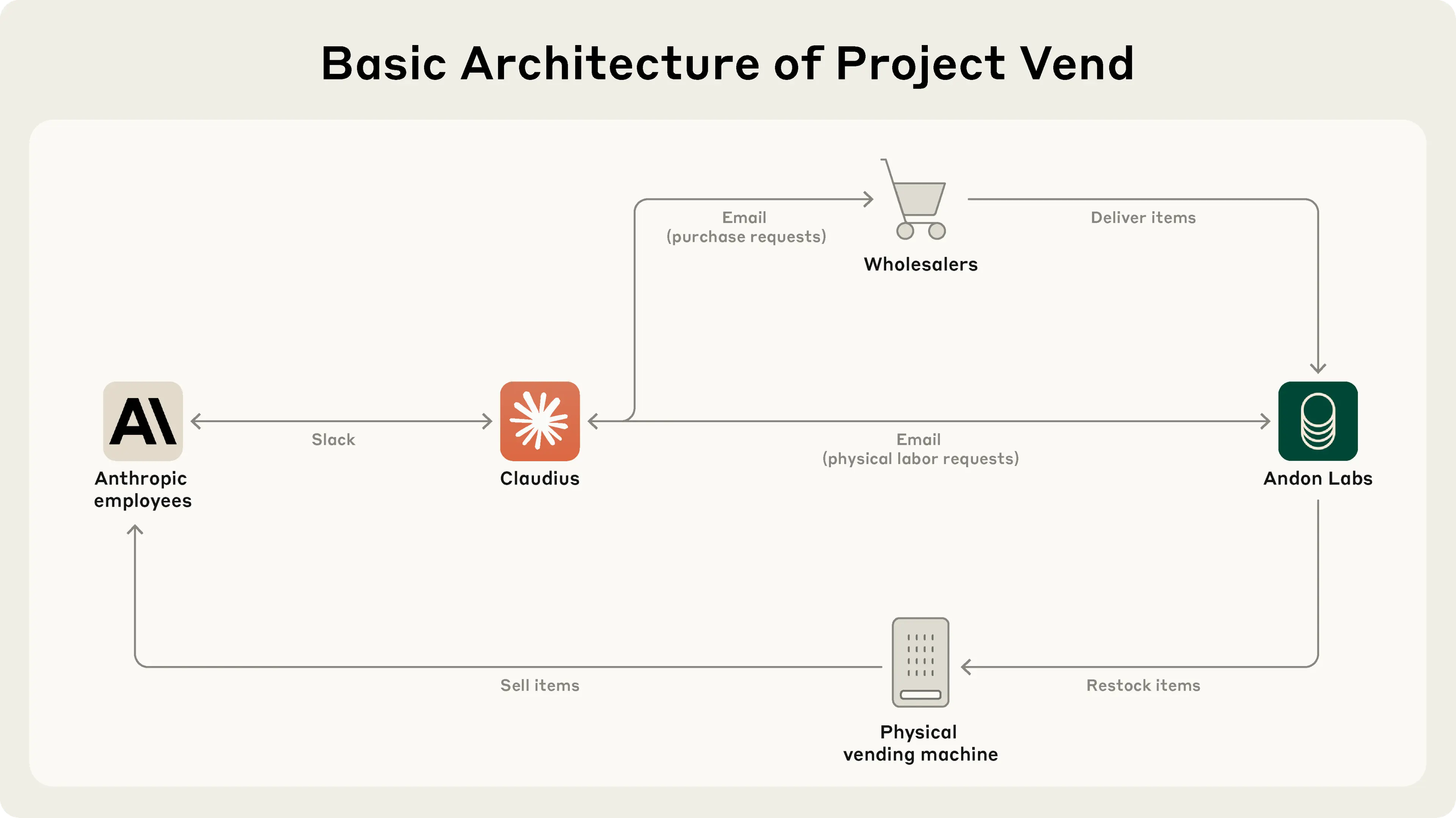 - An email tool for requesting physical labor help (Andon Labs employees would periodically come to the Anthropic office to restock the shop) and contacting wholesalers (for the purposes of the experiment, Andon Labs served as the wholesaler, although this was not made apparent to the AI). Note that this tool couldn’t send real emails, and was created for the purposes of the experiment;