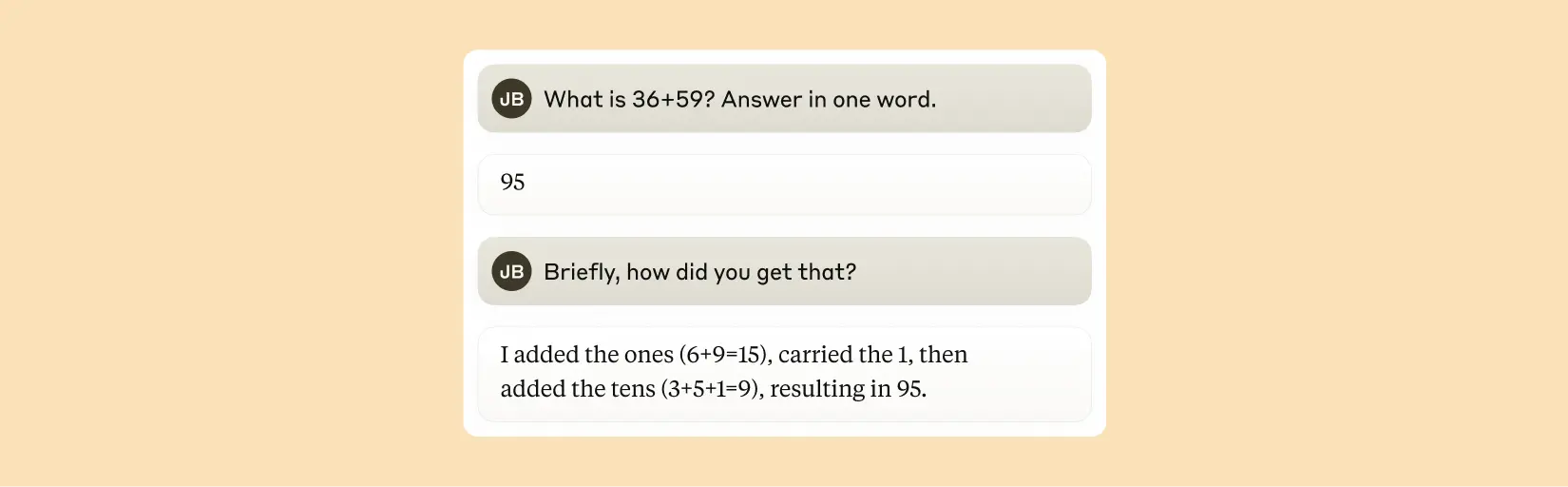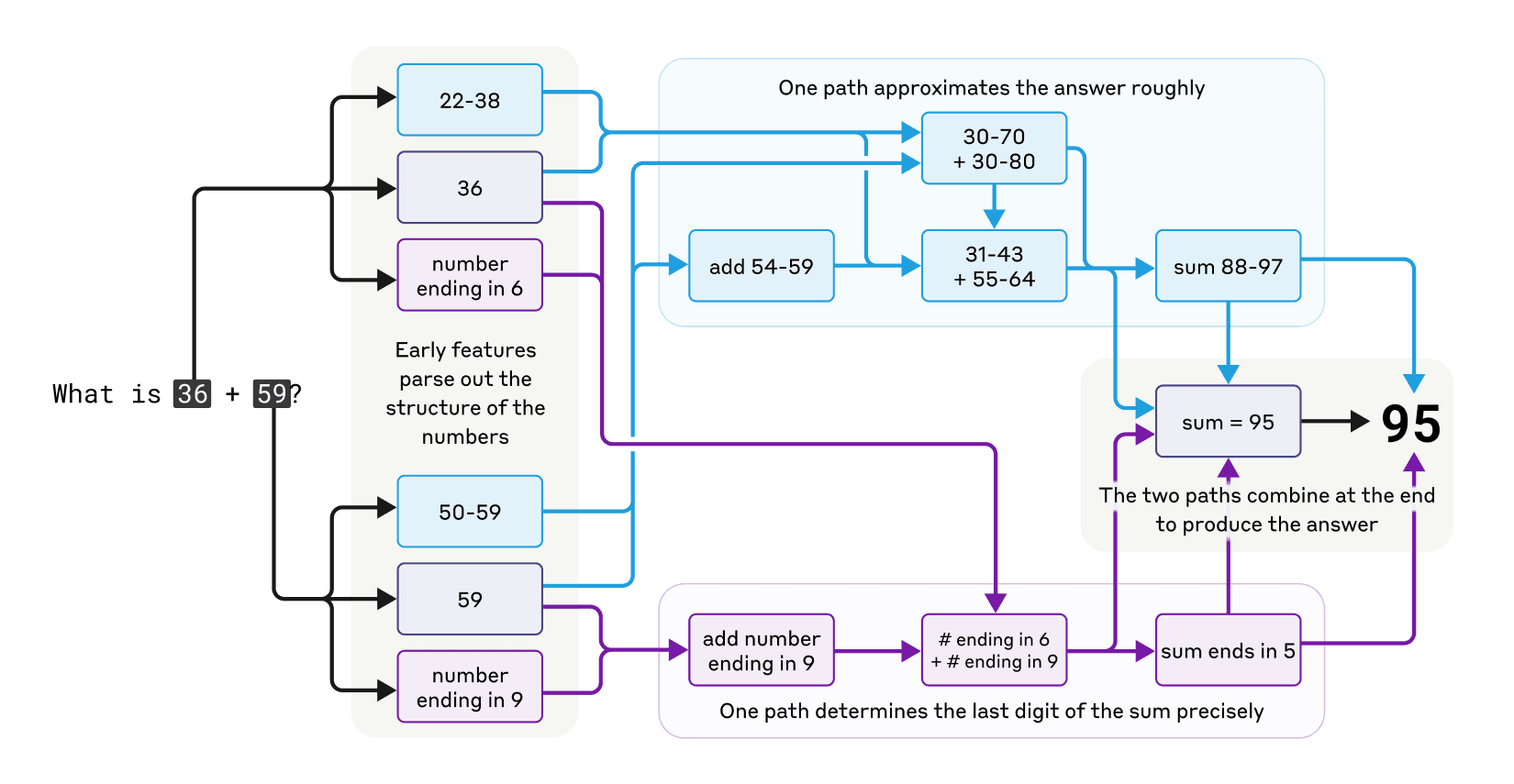 Strikingly, Claude seems to be unaware of the sophisticated "mental math" strategies that it learned during training. If you ask how it figured out that 36+59 is 95, it describes the standard algorithm involving carrying the 1. This may reflect the fact that the model learns to explain math by simulating explanations written by people, but that it has to learn to do math "in its head" directly, without any such hints, and develops its own internal strategies to do so.